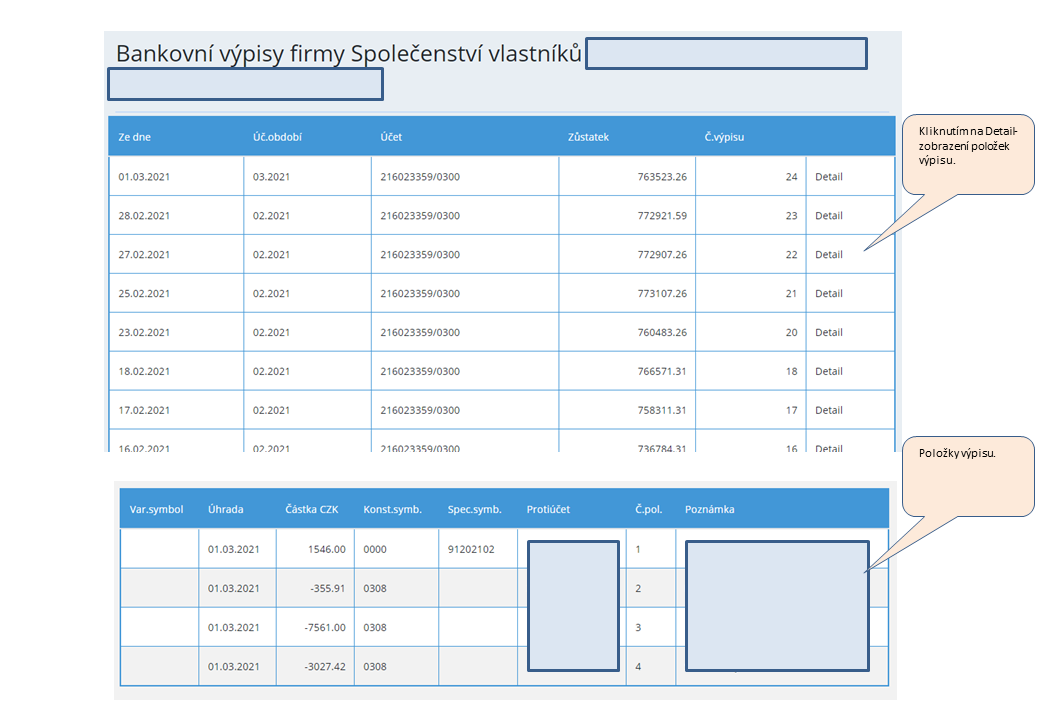 - Detail. Kliknutím na odkaz jsou zobrazeny položky bankovního výpisu.