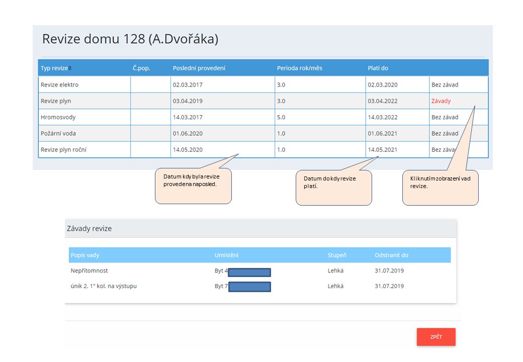 Propadlé revize nebo Závady revizí jsou zobrazeny červeně.