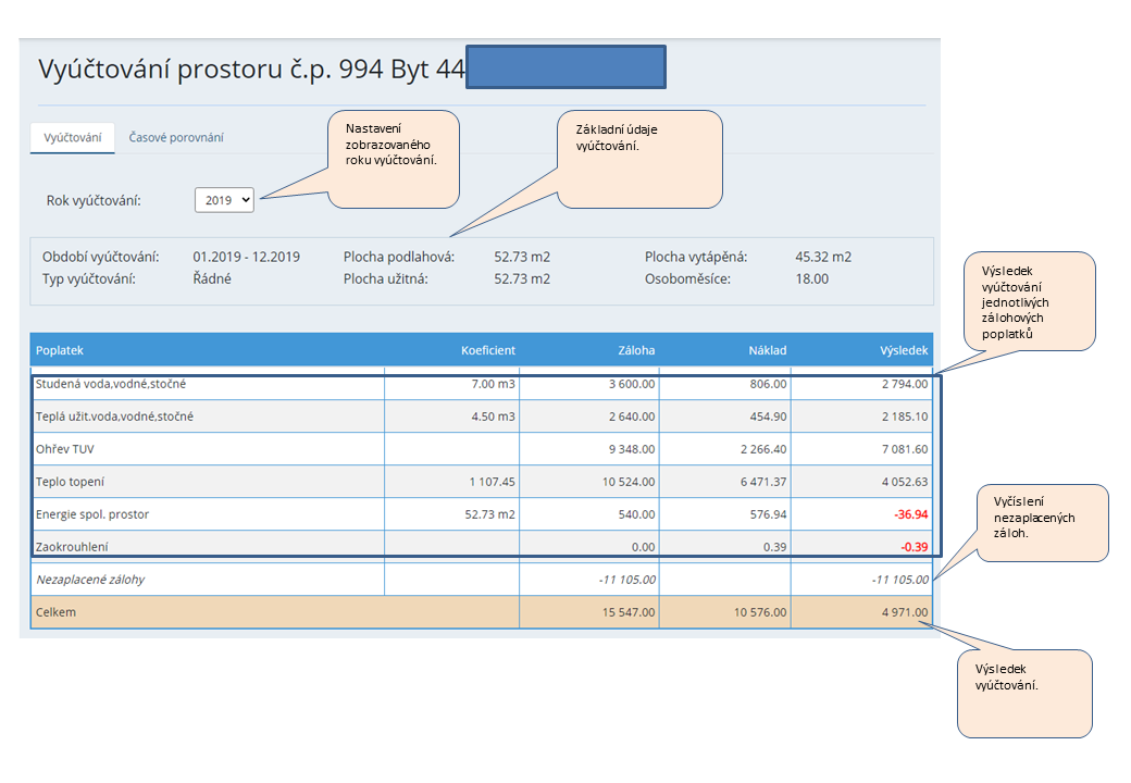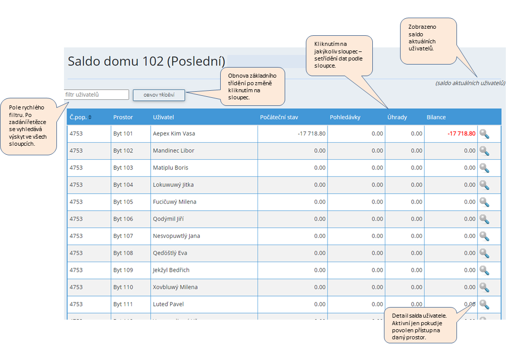 V přehledu jsou jen aktuální uživatelé prostor, tedy osoby které aktuálně bydlí. Dluhy ukončených uživatelů bývají součástí Výkazu domu Záporné hodnoty jsou dluh.