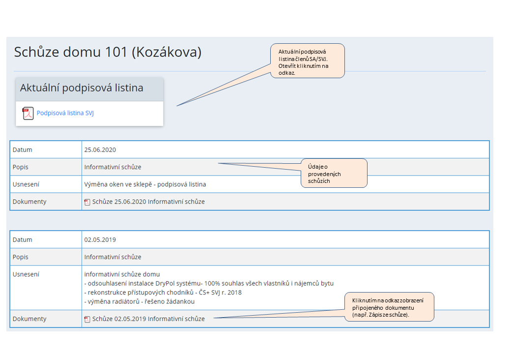 Kliknutím na odkaz se zobrazí aktuální podpisová listina pro pořádání schůze.
