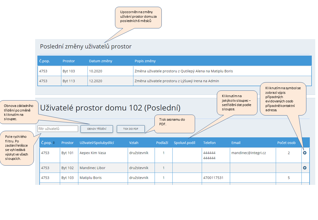 V přehledu jsou jen aktuální uživatelé prostor, tedy osoby které aktuálně bydlí.
